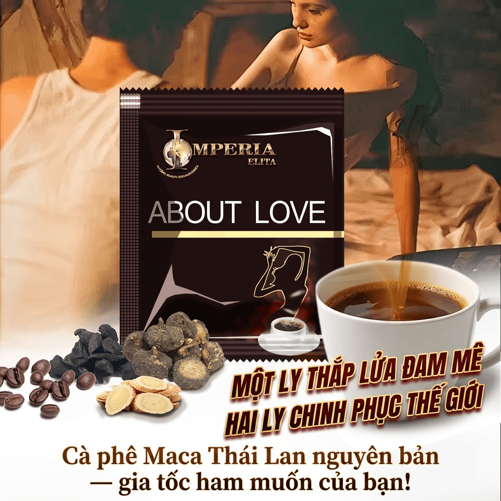 Cà phê ABOUT LOVE — công thức Tongkat Ali & Tribulus Terrestris, sản xuất theo tiêu chuẩn Đức, thành phần tự nhiên lành tính.